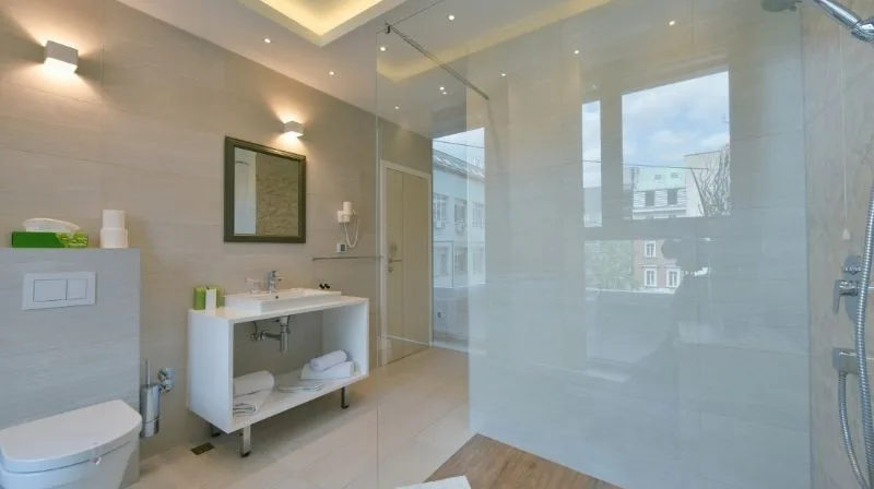 A minimalist bathroom with a floating vanity, glass shower, and neutral stone tones — a serene sanctuary of modern relaxation.