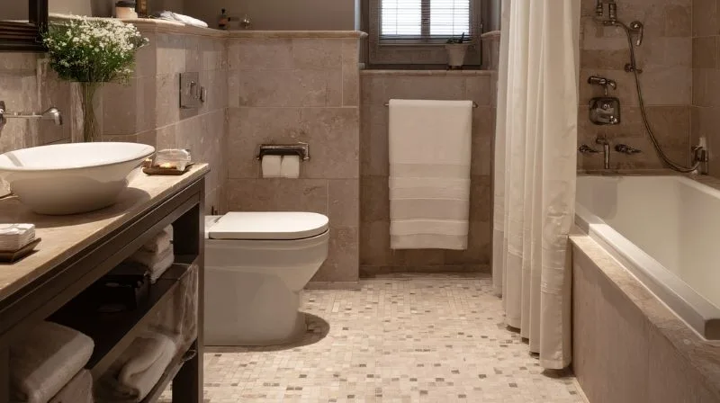 Embrace the harmony of raw textures and modern elegance — a rustic minimalist bathroom redefined.