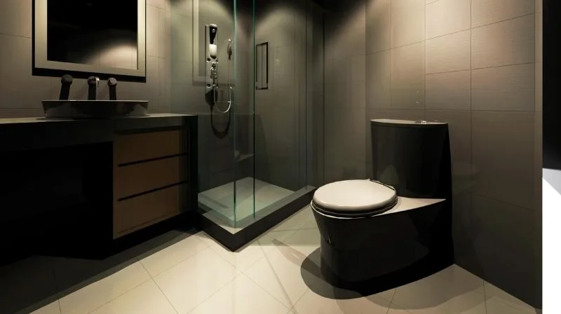 A sleek, modern bathroom featuring grey tiles, black fixtures, and a floating vanity — blending minimalist design with urban sophistication.