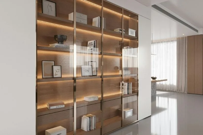 A minimalist wardrobe with built-in lighting, blending elegance and functionality.