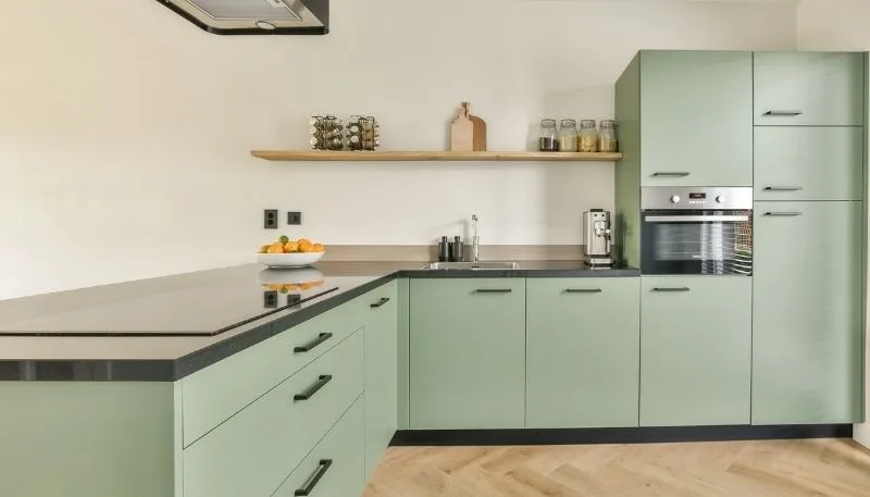 Chic green and black cabinetry with marble accents and under-cabinet lighting create a modern kitchen of style and utility.